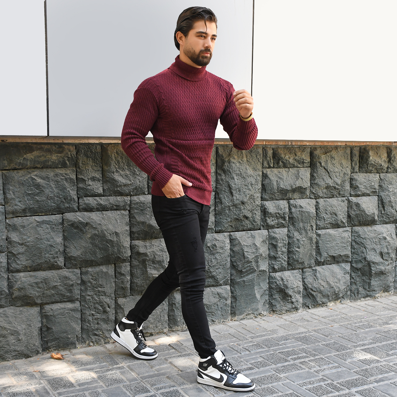 پلیور یقه اسکی زرشکی طرح راه راه مردانه مدلT10